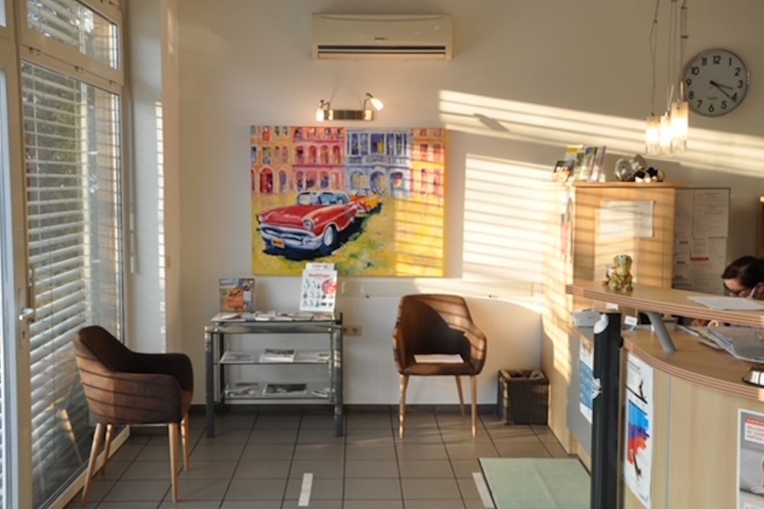Die helle und großzügige Praxis ist mit modernem Röntgengerät und einem umfangreichen Labor ausgestattet.